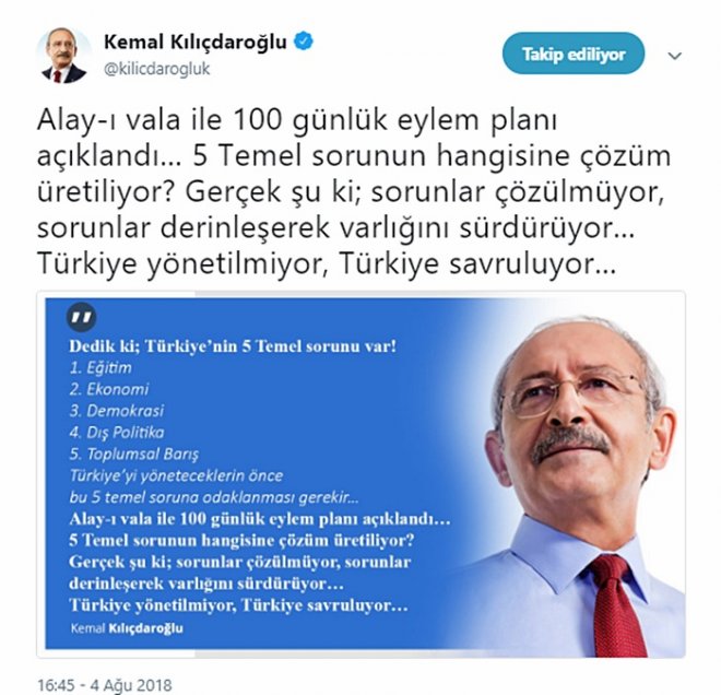 CHP Lideri Kemal Kılıçdaroğlu, geçtiğimiz gün Cumhurbaşkanı Erdoğan’ın açıkladığı 100 günlük eylem planı hakkında eleştirilerde bulundu. Açıklanan 100 günlük eylem planında, Türkiye’nin 5 sorununa da çözüm üretilmediğini ifade eden Kemal Kılıçdaroğlu Twitter hesabından yaptığı paylaşımında, eğitim, ekonomi, demokrasi, dış politika ve toplumsal barış olmak üzere Türkiye’nin bu 5 sorununa odaklanması gerektiğini, sorunlara çözüm üretilmediğini, sorunların daha da derinleştiğini ve Türkiye’nin yöneltilmediğini, savrulduğunu söyledi. İşe Kemal Kılıçdaroğlu’nun paylaşımı: