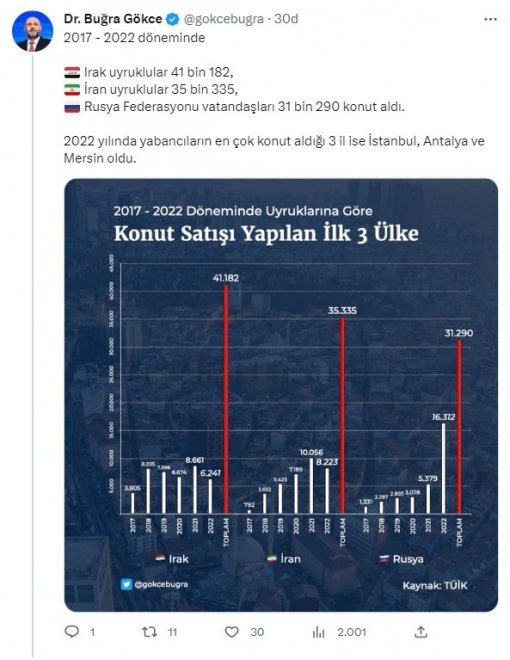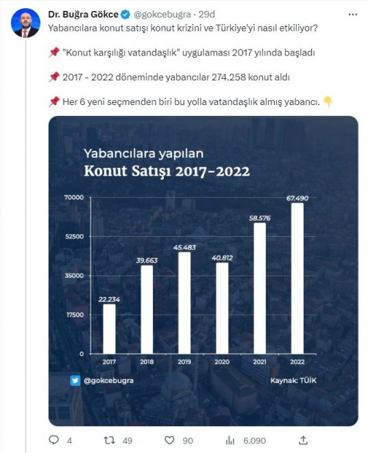 İstanbul Büyükşehir Belediyesi Genel Sekreter Yardımcısı Dr. Buğra Gökçe, son 5 yılda yabancılara satılan konut sayısına ve Türk vatandaşlığı alan yabancı seçmenlere dikkat çekti. Edinilen bilgilere göre; “Yabancılara konut satışı konut krizini ve Türkiye’yi nasıl etkiliyor?” başlığıyla sosyal medya hesabından dikkat çeken bir analiz paylaşan Gökçe şu değerlendirmelerde bulundu: