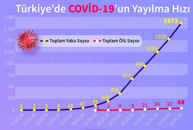 Çin Wuhan merkezli corona virüsü Türkiye dahil dünyanın birçok ülkesinde can almaya devam ediyor. Sözcü'den edinilen bilgilere göre; Ortaya çıktığı Aralık 2019'dan bu yana 197 ülke ve bölgeye yayılan virüs, küresel ölçekte 19 bine yakın cana mâl oldu. Türkiye'deki rakamlara ilişkin son güncelleme ise dün gece saatlerinde Sağlık Bakanı Fahrettin Koca'dan geldi. İlk vakanın 10 Mart'ta tespit edildiği ülkemizde bugüne dek 1872 kişiye corona virüsü teşhisi koyuldu. Vaka bazında 343 kişiyle en yüksek artış son 24 saatte yaşandı. Hayatını kaybedenlerin sayısı ise yedi kişi artarak, 44 kişiye yükseldi. Türkiye dünya genelinde corona virüsünden en çok ölümün yaşandığı 15'inci ülke oldu.