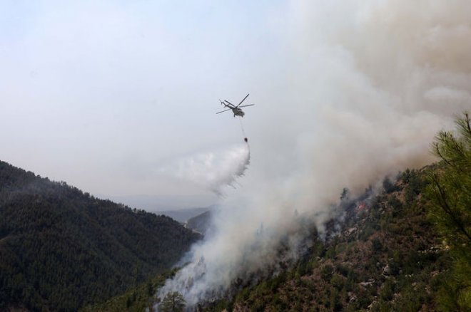 Yangınlara müdahale için Ukrayna'dan getirilen 4 helikopterden 2'si Yazılı Kanyon Tabiat Parkı'ndaki yangını söndürmek için çalışma yürütüyor.