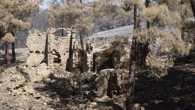 Antalya'nın Manavgat ilçesinde 10 gündür devam eden orman yangınlarından, ilçeye bağlı Bucakşeyhler Mahallesi'nde yer alan Lyrbe Antik Kenti de etkilendi. Helenistik çağda, milattan önce 3'üncü yüzyılda kurulan antik kentin çevresindeki ağaçlar kül olurken, birçok noktada ise alev ve duman nedeniyle is meydana geldi.