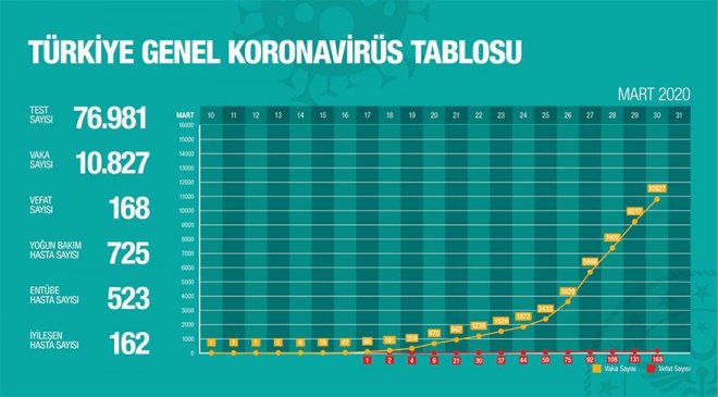 Yayımlanan son verilerin ardından Türkiye’deki vaka sayısı 10 bin 827’ye ulaşırken, hayatını kaybedenlerin sayısı ise 168’e çıktı. Verilere göre şimdiye kadar iyileşen hasta sayısı da 162.
