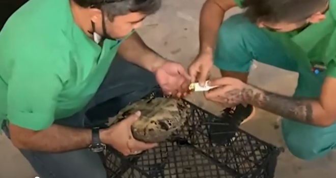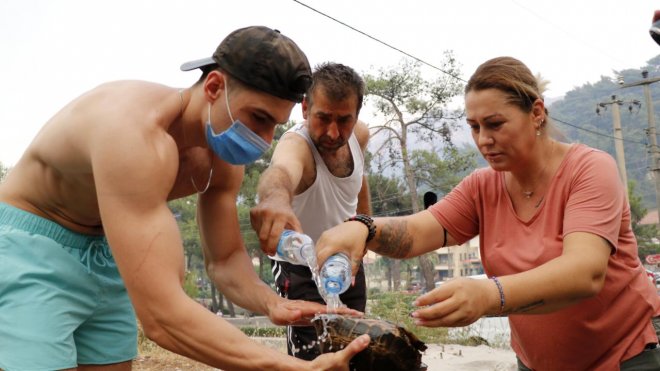 Kurtulan yaralı hayvanların hayata tutunmasına yardımcı olan Büyükşehir ekipleri yanan bir kaplumbağayı da tedavi etti. Kaplumbağanın yanan ayakları ilaçla temizlendikten sonra yanık merhemi ile tedavi edildi. Kaplumbağanın yangında hasar gören kabuğu da ilaçlanarak acısı dindirildi.