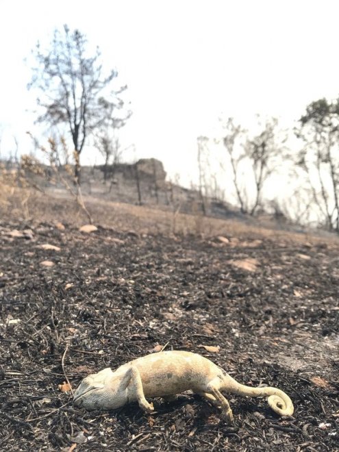 Bu sırada ormanlık alandaki yaban hayatı da sarsıldı. Manavgat'da büyük bir kısmın kontrol altına alınan yangın, büyük bir habitata zarar verdi. Söndürülen arazide bir bukalemun ölmüş halde görüldü. Beyaz renkteki bukelemunun Akdeniz bukelamenu olduğu tahmin ediliyor.