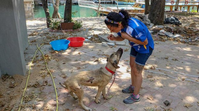 Antalya'nın Manavgat ilçesindeki yangında yaralanan hayvanları arayan Hayvan Hakları Federasyonu (HAYTAP) ekibini görünce koşarak yanlarına gelen yaralı köpeği alıp sahra çadırına götüren ekipten HAYTAP Aydın Temsilcisi Şenay Tekinbaş, "Geldi, 'Ben de hastayım, yandım, zarar gördüm' der gibi ayaklarımıza kapandı" dedi. Sahra hastanesine götürülüp, ilk müdahalesi yapılan köpeğe 'Ateş' adı koyuldu.