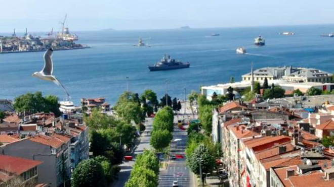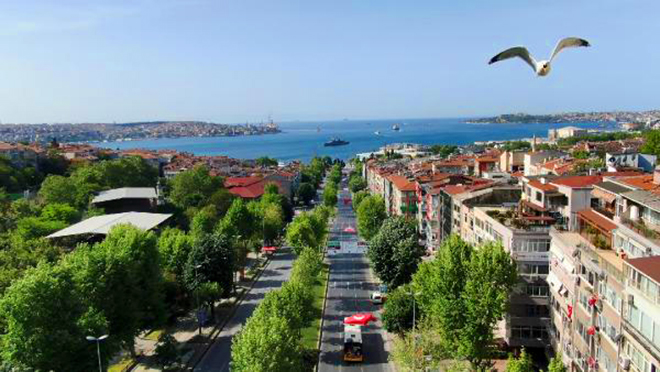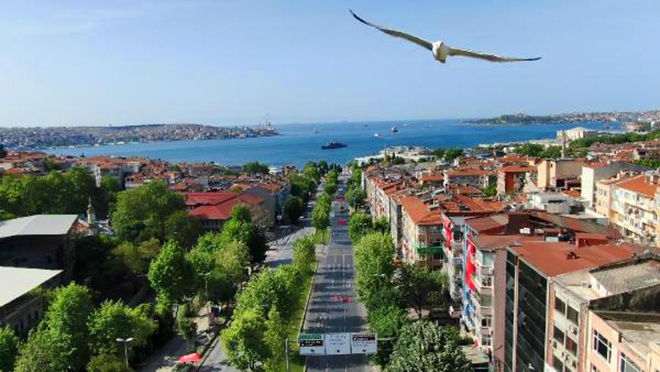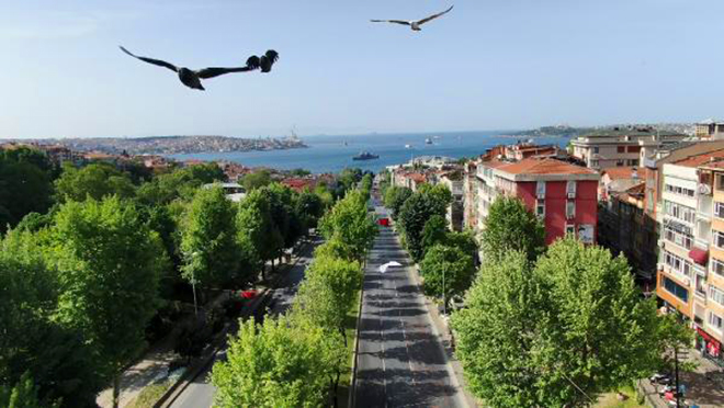 Beşiktaş Barbaros Bulvarı, 19 Mayıs Atatürk'ü anma Gençlik ve Spor Bayramı nedeniyle kırmızı beyaza büründü. Görsel şölen oluşturan manzara havadan görüntülendi. Çevrede bulunan martı ve kargalar ise çekim boyunca drone eşlik etti.