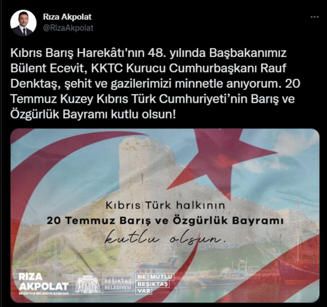 Beşiktaş Belediye Başkanı Rıza Akpolat, Kıbrıs Barış Harekâtı'nın 48. yılı dolayısıyla paylaştığı mesajında, "Kıbrıs Barış Harekâtı'nın 48. yılında Başbakanımız Bülent Ecevit, KKTC Kurucu Cumhurbaşkanı Rauf Denktaş, şehit ve gazilerimizi minnetle anıyorum. 20 Temmuz Kuzey Kıbrıs Türk Cumhuriyeti’nin Barış ve Özgürlük Bayramı kutlu olsun!" ifadelerini kullandı.