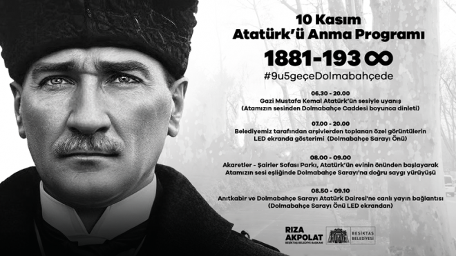 Saatler 09.05’i gösterdiğinde ise tüm Türkiye’de olduğu gibi Beşiktaş’ta da hayat duracak ve Ata’mıza saygı duruşuna geçilecek. Beşiktaş Belediye Başkanı Rıza Akpolat, "9'u 5 Geçe Dolmabahçe'de zaman duracak. Ulu Önderimiz Mustafa Kemal Atatürk’ü aramızdan ayrılışının yıl dönümünde 10 Kasım sabahı gerçekleştireceğimiz saygı yürüyüşü ile başlayacak anma programımıza tüm halkımızı bekliyorum." dedi.