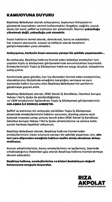 Beşiktaş Belediyesi olarak, DİSK Genel-İş Sendikası, İstanbul Avrupa Yakası 1 No’lu Şube ile sürdürdüğümüz ve 1.849 emekçimizi ilgilendiren Toplu İş Sözleşmesi görüşmelerimiz anlaşma ile sonuçlanmıştır. Beşiktaş halkına hizmet eden emekçilerimizin insan onurunu yaraşır bir şekilde yaşaması için, alın teri yere düşmeden emeğinin hakkını teslim etmiş olmaktan dolayı mutluyuz. Kurum yöneticilerimiz, kamu emekçilerimiz ve işçilerimiz, üzerinden ortaklaştığımız ilkelerden güç alarak Beşiktaş halkına hizmet etmeye devam edecektir. Beşiktaş halkına, emekçilerimize ve bizleri destekleyen değerli kamuoyuna saygıyla duyurulur.