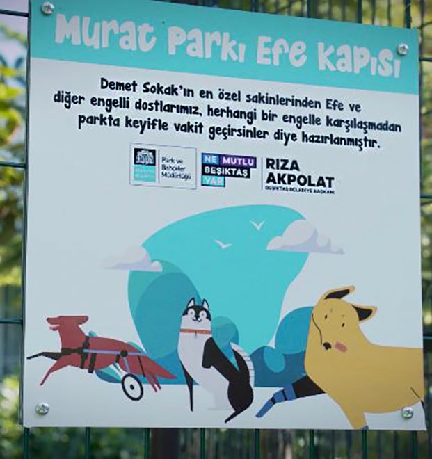 Beşiktaş Belediyesi, ilçe sakini Zeynep Berk’in sokaktan sahiplendiği ve yaşlılıktan dolayı merdivenleri çıkamayan köpeği ‘Efe’ için özel kapı yaptı. Murat Parkı’nda tüm engelli dostları için tasarlanan özel kapıya ise isminin ilham kaynağı olan ‘Murat Parkı Efe Kapısı’ adı verildi.