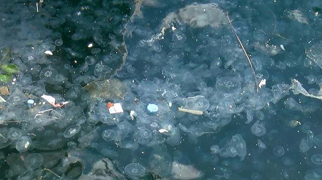 Sahilde yürüyüş yapan vatandaşlar, kıyıda duran on binlerce denizanasını görünce şaşkına uğradı. Denizanalarının yığıldığı kıyı şeritteki deniz kirliliği de dikkati çekti.