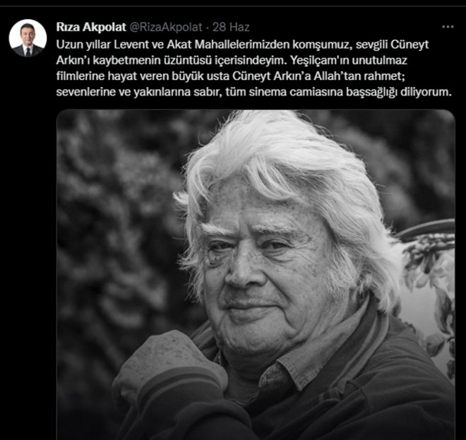 "Uzun yıllar Levent ve Akat Mahallelerimizden komşumuz, sevgili Cüneyt Arkın’ı kaybetmenin üzüntüsü içerisindeyim. Yeşilçam'ın unutulmaz filmlerine hayat veren büyük usta Cüneyt Arkın’a Allah’tan rahmet; sevenlerine ve yakınlarına sabır, tüm sinema camiasına başsağlığı diliyorum."