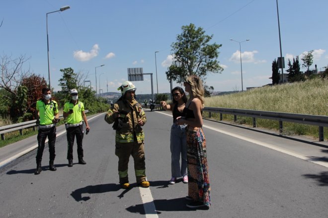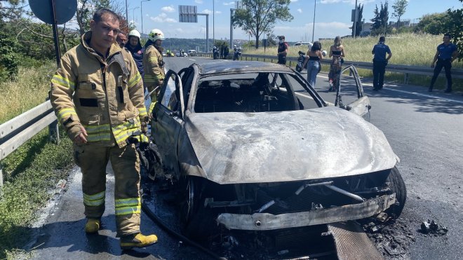 Araç sürücüsü Tuana Sert “Araç birden motor uyarısı verdi. Aracı kenara çektikten sonra dörtlüleri yaktım. Arkadaşım yanımda oturuyordu. Arkadaşımın tarafından duman gelmeye başlayınca kontağı kapatıp araçtan uzaklaştık. Zaten yerlere yağ birikintileri dökülmüş. Zaten çok çabuk alev aldı. Motor uyarısı vermişti zaten direkt kontağı kapatıp dışarı çıktık. Ben çantamı aldım telefonumu alabildim. Arkadaşım eşyalarını alamadı, kredi kartlarım, sürücü kimliğim hepsi içerde kaldı” dedi.