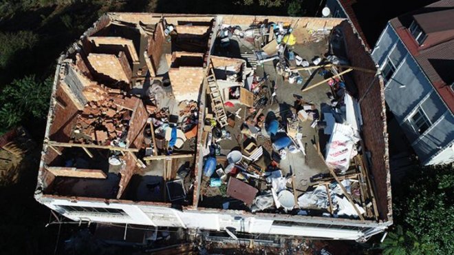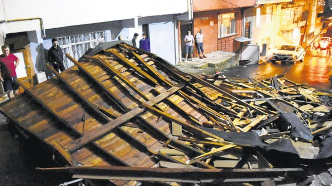 Fırtına nedeniyle çok sayıda evin çatısı uçtu, park halindeki araçlar zarar gördü. Sarıyer’de yağmuru izlemek için balkona çıkan çift, salona döndüklerinde kalktıkları koltuğun üzerinde karşı binanın bacasını buldu. Odalarının duvarını yıkan bacayı gören çift ölümden döndü.