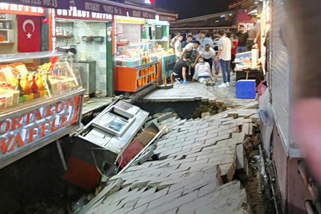 Beşiktaş Ortaköy’de araç trafiğine kapalı olan kumpircilerin olduğu sokakta henüz bilinmeyen bir nedenle çökme meydana geldi. Olayda hafif yaralan kadın hastaneye kaldırılırken, dükkanlar boşaltıldı. Edinilen bilgilere göre; olay, saat 23.30 sularında Beşiktaş Ortaköy’deki Kumpirci dükkanlarının olduğu sokakta meydana geldi. Araç trafiğine kapalı olan sokakta henüz bilinmeyen bir nedenle yolda çökme meydana geldi. Çökme sırasında oradan geçen bir kadın göçen yerin altında kaldı. Göçük sırasında dükkanlarda çalışan vatandaşlar ise panik içinde dışarıya koştu.