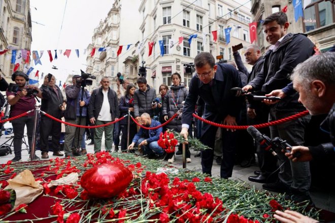 Terör saldırısının gerçekleştirildiği noktaya konumlandırılan anma noktasına karanfil bırakan İmamoğlu, burada da “Terörizme karşı, terör örgütlerine karşı dimdik, 16 milyon İstanbullu var İstanbul'da. 86 milyon milletimizle beraber, milletçe, omuz omuza mücadele vereceğiz ve hiçbir zaman asla terörizmin bu hamlelerine karşı yüzümüz aşağı eğilmeyecek. İstanbul'umuzun göz bebeği İstiklal Caddesi'ndeyiz. İstanbul'a turistleri, şehrimizin misafirlerini ve şehrimizin insanlarını, dünden daha güvende oldukları bir ortamda ağırlamanın üzerimize düşen sorumluluğunu ortaya koyacağız. Kimse bundan kuşku duymasın. Terörizmi, terör örgütlerinin dün en üst seviyede kınadığımız gibi, şimdi de kınıyoruz. Allah, milletimizi korusun. Bizler omuz omuzayız, yan yanayız. Devletimizin her kurumuyla, her birimiyle bir arada mücadelemizi vereceğiz” açıklamasında bulundu.