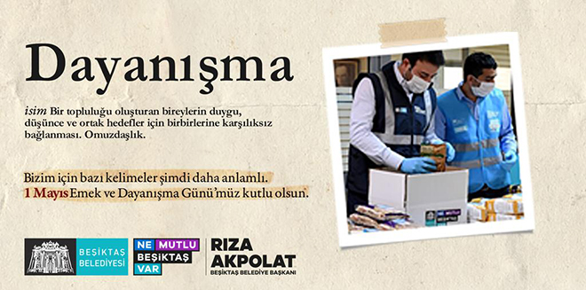 Belediye ilçenin birçok noktasına, belediye emekçileri ve sağlık çalışanlarının bu süreçteki emeklerine saygı vurgusunu ön plana çıkaran ‘’İş, Emek ve Dayanışma’’ kavramlarının sözcük anlamlarının yer aldığı afişler astı. Billboardlarda; gerek sahada gerekse iş yerlerinde fedakârca çalışan emekçilerin fotoğraflarının yanı sıra Koronavirüse karşı mücadelesinde belediye ekipleriyle sosyal mesafeye uyarak omuz omuza çalışan Beşiktaş Belediye Başkanı Rıza Akpolat’ın dayanışma fotoğraflarına da yer verildi. Yapılan çalışma, Başkan Akpolat’ın ‘’Bizim için bazı kelimeler şimdi daha anlamlı, 1 Mayıs Emek ve Dayanışma Günü’müz kutlu olsun ‘’ mesajıyla paylaşıldı.