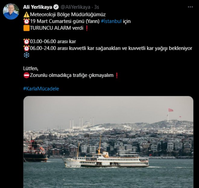 İstanbul’da bugün başlayan kar yağışının hafta sonu da etkili olması bekleniyor. Edinilen bilgilere göre; İstanbul Valisi Ali Yerlikaya da sosyal medya hesabından kent için turuncu alarm verildiğini açıkladı. Vali Yerlikaya, paylaşımında şunları belirtti: