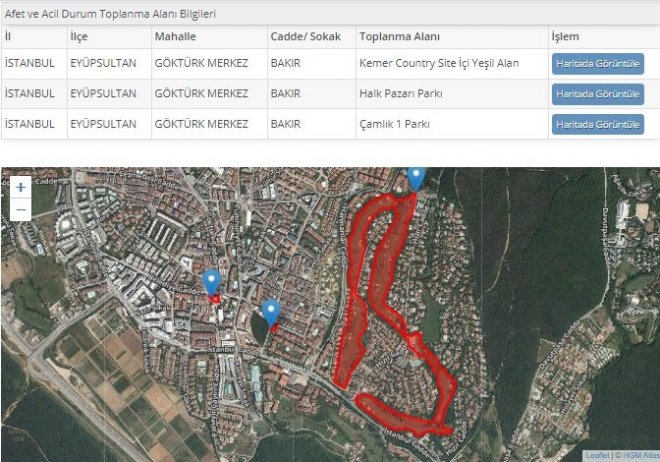 E-devlet üzerinden Afet ve Acil Durum Yönetimi Başkanlığı'nın (AFAD) , “Afet ve Acil Durum Toplanma Alanı Sorgulama” hizmetini kullandığınızda Eyüpsultan Göktürk Mahallesi'nde 3 adet toplanma alanı çıkıyor.