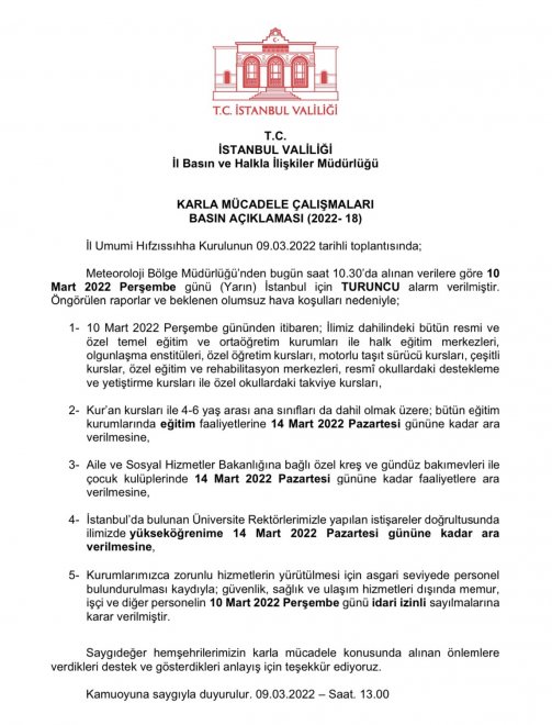 Yerlikaya, "Eğitime 14 Mart'a kadar ara verdik. Güvenlik, sağlık, ulaşım dışındaki görev alan personelin bugün idari izinli olmasını kararlaştırmıştık. Gece saat 04:00 itibariyle Anadolu ve Trakya'dan gelen TIR ve kamyonların şehir içi girişini durdurduk. Meteoroloji'den aldığımız veriler ışığında bugün saat 10:40 itibariyle hala devam ediyor, geçişlerine izin veriyoruz. Hava koşulları müsaade ettiği sürece geçişlerine izin vereceğiz. İki yeni karar daha aldık. Kamu kurumlarında hamile ve engelliler 11 Mart günü idari izinli sayılacak. Bugün saat 19:00 itibariyle motosiklet ve scooter'ların trafiğe çıkışına izin verilmeyecek, motokuryelik yapılmayacaktır. zorunlu olmadıkça trafiğe çıkmayalım, toplu taşıma araçlarını tercih edelim" dedi.