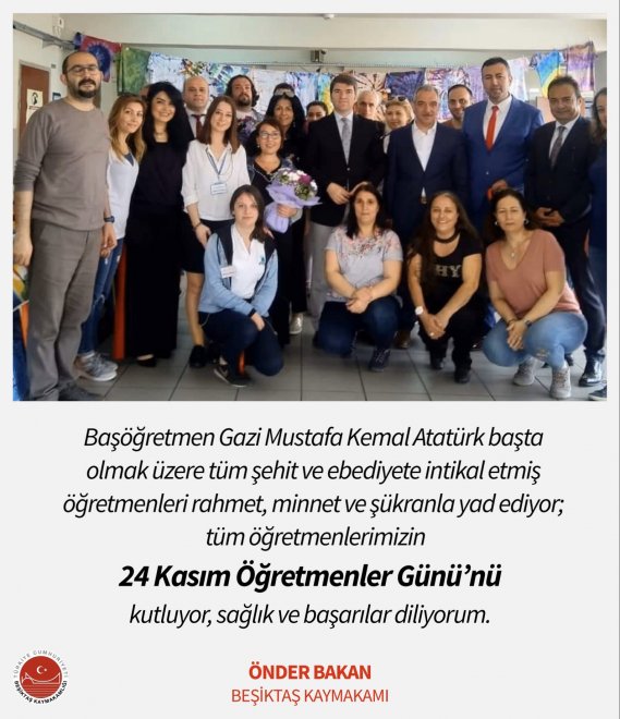 Beşiktaş Kaymakamlığı, resmi Twitter hesabında Beşiktaş Kaymakamı Önder Bakan'ın 24 Kasım Öğretmenler Günü kutlama mesajını resmi Twitter sayfasında paylaştı. Kaymakam Önder Bakan, kutlama mesajında aşağıdaki ifadeleri kullandı: