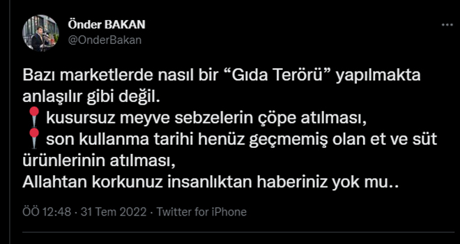 Yapılan araştırmalar sonucu, henüz bozulmamış meyve ve sebzelerin çöpe atıldığı, son kullanma tarihi henüz geçmemiş olan et ve süt ürünlerinin atıldığını tespit eden Beşiktaş Kaymakamı Önder Bakan, bu duruma Twitter hesabından yaptığı paylaşımında tepki gösterdi. Kaymakam Bakan, paylaşımında aşağıdaki ifadelere yer verdi: