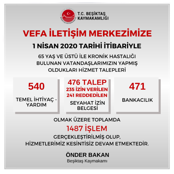 Beşiktaş Kyamakamlığı'ndan yapılan açıklamada, Vefa İletişim Merkezi'ne 1 Nisan 2020 tarihi itibariyler 65 yaş üstü ve kronik rahatsızlığı bulunan vatandaşların yapmış olduğu hizmet talepleri açıklandı. Buna göre; 540 temel ihtiyaç yardım, 476 talep 235 izin verilen ve 241 reddedilen seyahat izin belgesi, 471 bankacılık olmak üzere toplamda 1487 işlem gerçekleştirilmiş olup, hizmetler kesintisiz devam etmektedir.