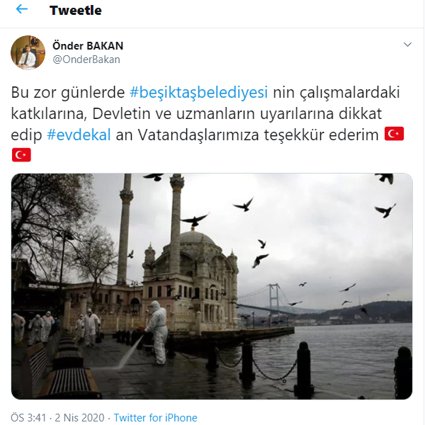 "Bu zor günlerde #beşiktaşbelediyesi nin çalışmalardaki katkılarına, Devletin ve uzmanların uyarılarına dikkat edip #evdekalan Vatandaşlarımıza teşekkür ederim."