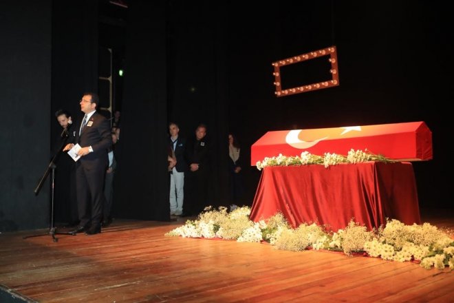 İstanbul Büyükşehir Belediye (İBB) Başkanı Ekrem İmamoğlu, Türk tiyatrosunun duayen ismi usta sanatçı Yıldız Kenter için Şişli Kenter Tiyatrosu’nda düzenlenen anma törenine katıldı. Geçtiğimiz Pazar günü akciğer rahatsızlığı nedeniyle tedavi gördüğü hastanede hayatını kaybeden Kenter’in Türk bayrağına sarılı tabutu, İBB Zabıta Taburu’nun omuzlarında yıllarca üzerinde sanatını icra ettiği sahneye getirildi. Kenter'in sanatçı arkadaşlar ve sevenleri tiyatro sahnesine çıkarak veda konuşmalarını gerçekleştirdi. Törende konuşan İmamoğlu, duygularını şu sözlerle dile getirdi: