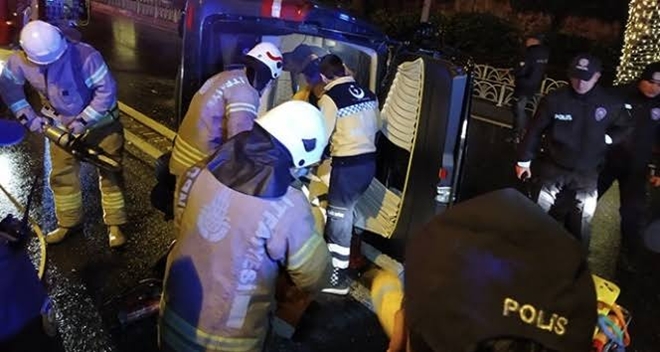 Beşiktaş Dolmabahçe Caddesi’nde kayganlaşan yoldan sürücüsünün direksiyon hakimiyetini kaybettiği panelvan araç kontrolden çıkarak devrildi. Kazada sürücü, yan yatarak devrilen aracın altında kalarak yaralandı. Kaza, saat 05.30 sularında Beşiktaş Vişnezade Mahallesi Dolmabahçe Caddesi’nde meydana geldi. Edinilen bilgiye göre, Beşiktaş istikametindenKaraköy yönüne giden henüz sürücüsünün ismi belirlenemeyen 34 BYE 126 plakalı panelvan araç, kayganlaşan yolda kontrolden çıktı. Sürücüsünün hakimiyetinden çıkan araç, savrulduktan sonra devrildi. Sürücü, devrilen aracın altında kalarak sıkıştı.