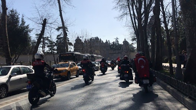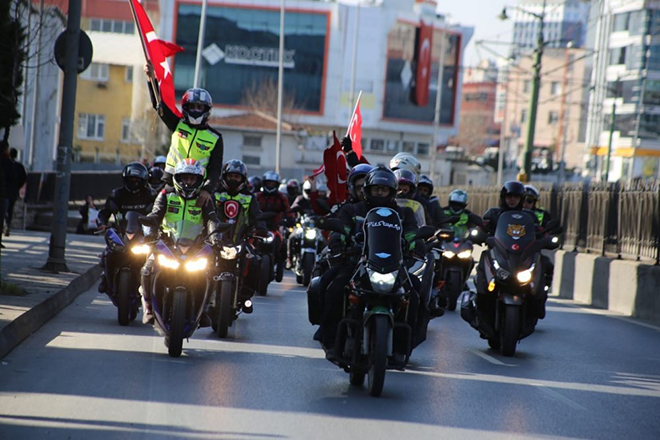 Suriye’nin İdlib kentinde rejim unsurlarının hain saldırısında şehit olan askerler için Beşiktaş’ta konvoy oluşturan yüzlerce motosiklet sürücüsü, Edirnekapı Şehitliği’ne gitti. Türk bayraklarıyla donatılan motosikletleri gören vatandaşlar da o anları cep telefonlarıyla görüntüledi.
