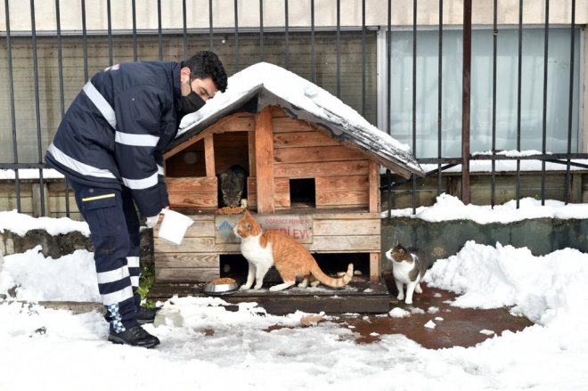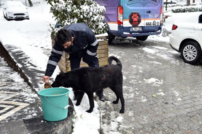 "Ekiplerimiz olumsuz hava koşullarında da 7/24 can dostlarımızın yanında olmaya devam ediyor. Siz de can dostlarımız için kapınızın önüne bir kap mama koymayı ihmal etmeyin."