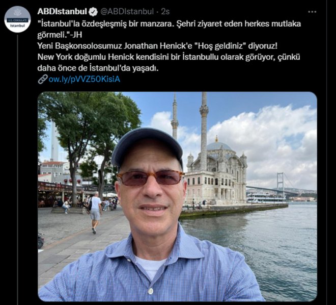 ABD yeni İstanbul Başkonsolosu Jonathan Henick, Ortaköy'de çekilmiş bir fotoğrafını paylaşarak, "İstanbul'la özdeşleşmiş bir manzara. Şehri ziyaret eden herkes mutlaka görmeli." ifadelerini kullandı.