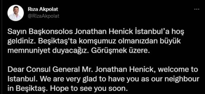 Beşiktaş Belediye Başkanı Rıza Akpolat, Twitter hesabından yaptığı paylaşımında, ""Sayın Başkonsolos Jonathan Henick İstanbul’a hoş geldiniz. Beşiktaş'ta komşumuz olmanızdan büyük memnuniyet duyacağız. Görüşmek üzere. Dear Consul General Mr. Jonathan Henick, welcome to Istanbul. We are very glad to have you as our neighbour in Beşiktaş. Hope to see you soon." ifadelerine yer verdi.