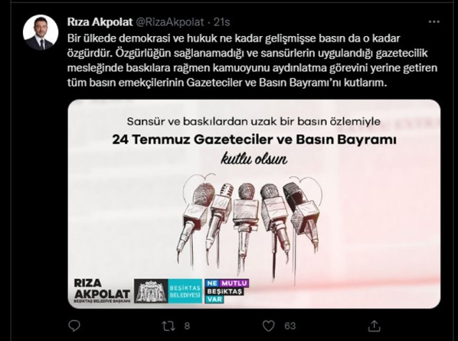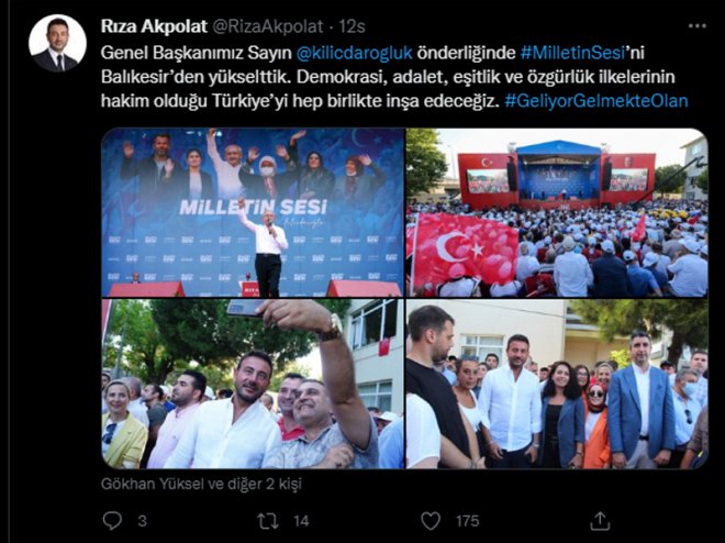 Beşiktaş Belediye Başkanı Rıza Akpolat, CHP Genel Başkanı Kemal Kılıçdaroğlu'nun Balıkesir'de gerçekleştridiği Milletin Sesi mitingi ile ilgili Twitter hesabında paylaşımda bulunarak, "Genel Başkanımız Sayın @kilicdarogluk önderliğinde #MilletinSesi’ni Balıkesir’den yükselttik. Demokrasi, adalet, eşitlik ve özgürlük ilkelerinin hakim olduğu Türkiye’yi hep birlikte inşa edeceğiz. #GeliyorGelmekteOlan" ifadelerine yer verdi.