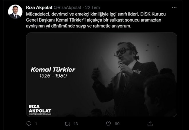 "Mücadeleci, devrimci ve emekçi kimliğiyle işçi sınıfı lideri, DİSK Kurucu Genel Başkanı Kemal Türkler’i alçakça bir suikast sonucu aramızdan ayrılışının yıl dönümünde saygı ve rahmetle anıyorum."