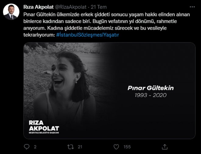 Başkan Rıza Akpolat, "Pınar Gültekin ülkemizde erkek şiddeti sonucu yaşam hakkı elinden alınan binlerce kadından sadece biri. Bugün vefatının yıl dönümü, rahmetle anıyorum. Kadına şiddetle mücadelemiz sürecek ve bu vesileyle tekrarlıyorum: #İstanbulSözleşmesiYaşatır" ifadelerini kullandı.
