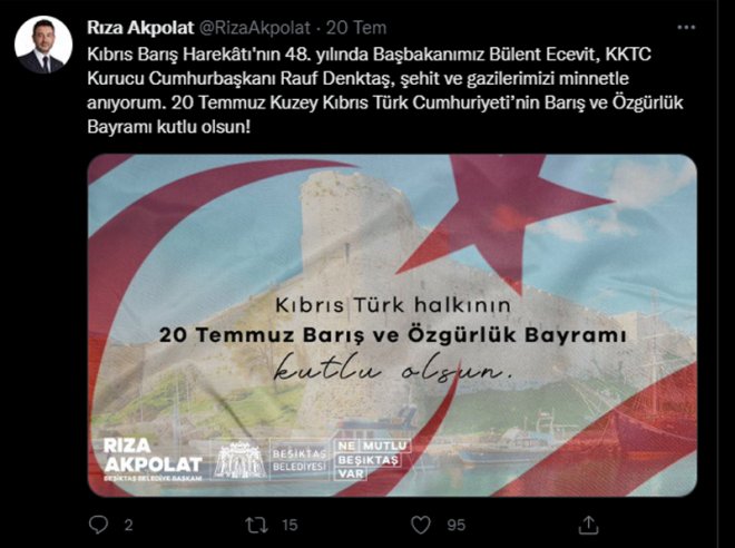 "Kıbrıs Barış Harekâtı'nın 48. yılında Başbakanımız Bülent Ecevit, KKTC Kurucu Cumhurbaşkanı Rauf Denktaş, şehit ve gazilerimizi minnetle anıyorum. 20 Temmuz Kuzey Kıbrıs Türk Cumhuriyeti’nin Barış ve Özgürlük Bayramı kutlu olsun!"