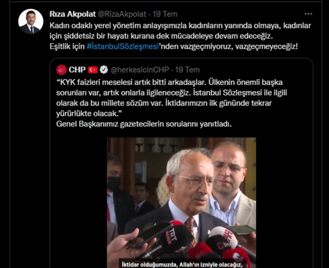 Gazetecilerin sorularını yanıtlayan CHP Genel Başkanı Kemal Kılıçdaroğlu'nun videosunu Twitter hesabında paylaşan Beşiktaş Belediye Başkanı Rıza Akpolat, "Kadın odaklı yerel yönetim anlayışımızla kadınların yanında olmaya, kadınlar için şiddetsiz bir hayatı kurana dek mücadeleye devam edeceğiz. Eşitlik için #İstanbulSözleşmesi’nden vazgeçmiyoruz, vazgeçmeyeceğiz!" ifadelerini kullandı.