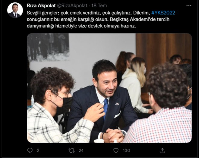"Sevgili gençler; çok emek verdiniz, çok çalıştınız. Dilerim, #YKS2022 sonuçlarınız bu emeğin karşılığı olsun. Beşiktaş Akademi’de tercih danışmanlığı hizmetiyle size destek olmaya hazırız."