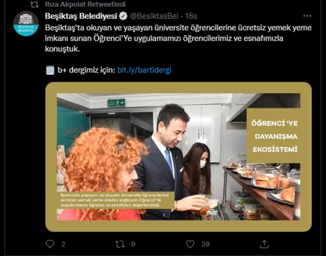 Başkan Akpolat, "Genel Başkanımız Sayın @kilicdarogluk ’nun çağrısı ile üniversite öğrencisi kardeşlerimizin KYK borçlarını geri ödemelerinde faiz ve enflasyon farkı alınmasına son verildi. #TeşekkürlerKılıçdaroğlu" paylaşımında bulunarak, CHP Genel Başkanı Kemal Kılıçdaroğlu'na teşekkür etti.