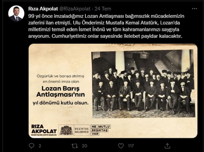 "99 yıl önce imzaladığımız Lozan Antlaşması bağımsızlık mücadelemizin zaferini ilan etmişti. Ulu Önderimiz Mustafa Kemal Atatürk, Lozan'da milletimizi temsil eden İsmet İnönü ve tüm kahramanlarımızı saygıyla anıyorum. Cumhuriyetimiz onlar sayesinde ilelebet payidar kalacaktır."