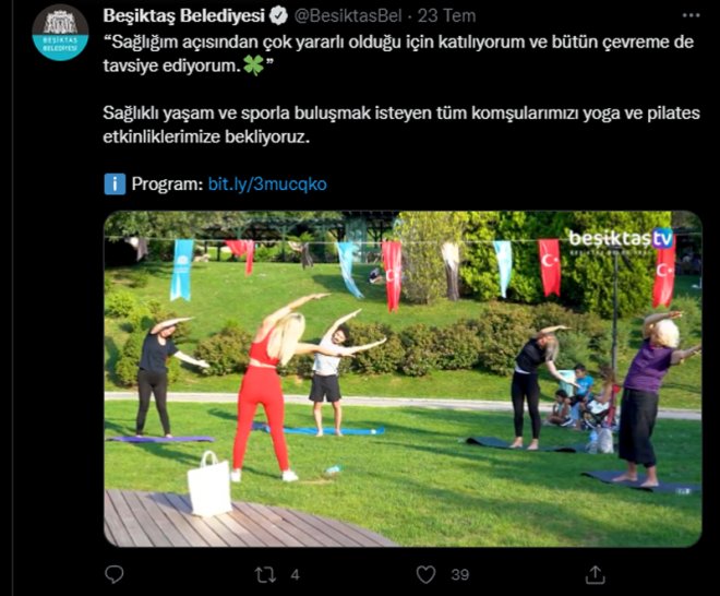 Beşiktaş Belediyesi, "Sağlıklı yaşam ve sporla buluşmak isteyen tüm komşularımızı yoga ve pilates etkinliklerimize bekliyoruz." dedi.