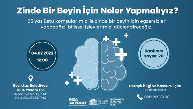 "65+ komşularımıza yönelik "Her Yaşta Beşiktaş" etkinliklerimiz kapsamında düzenlediğimiz “Zinde Bir Beyin için Neler Yapmalıyız?” konulu söyleşimiz Ulus Yaşam Evimizde gerçekleşecek. 4 Temmuz'da gerçekleşecek söyleşimize tüm yaş almış komşularımız davetlidir."