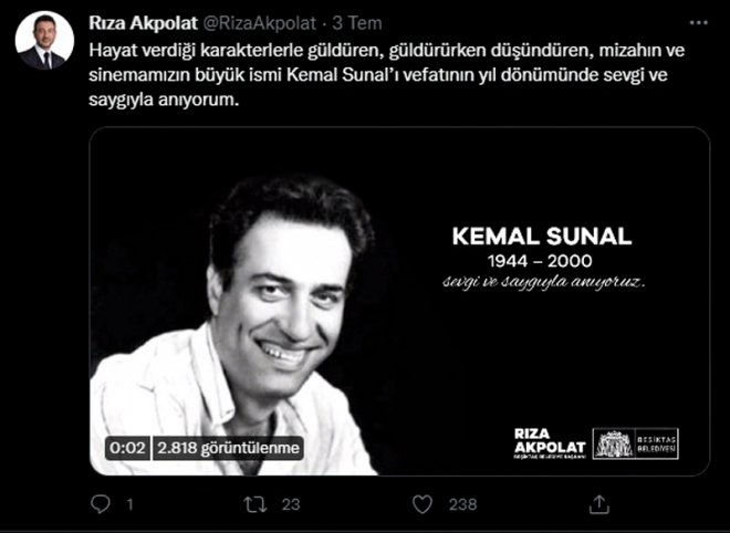 Beşiktaş Belediye Başkanı Rıza Akpolat, Kemal Sunal'ı vefatının yıl dönümünde andı: "Hayat verdiği karakterlerle güldüren, güldürürken düşündüren, mizahın ve sinemamızın büyük ismi Kemal Sunal’ı vefatının yıl dönümünde sevgi ve saygıyla anıyorum."