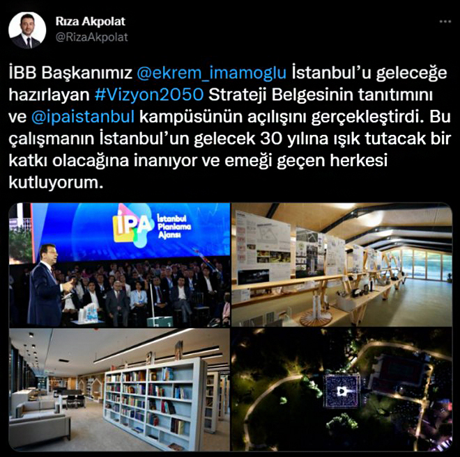 İBB Başkanı Ekrem İmamoğlu’nun Florya’daki İPA Kampus’un açılışında, İstanbul’u geleceğe hazırlayan Vizyon 2050 Strateji Belgesi'nin tanıtımını yaptı. Beşiktaş Belediye Başkanı Rıza Akpolat, Twitter hesabından yaptığı paylaşımında, "İBB Başkanımız @ekrem_imamoglu İstanbul’u geleceğe hazırlayan #Vizyon2050 Strateji Belgesinin tanıtımını ve @ipaistanbul kampüsünün açılışını gerçekleştirdi. Bu çalışmanın İstanbul’un gelecek 30 yılına ışık tutacak bir katkı olacağına inanıyor ve emeği geçen herkesi kutluyorum." ifadeleriyle İmamoğlunu kutladı.