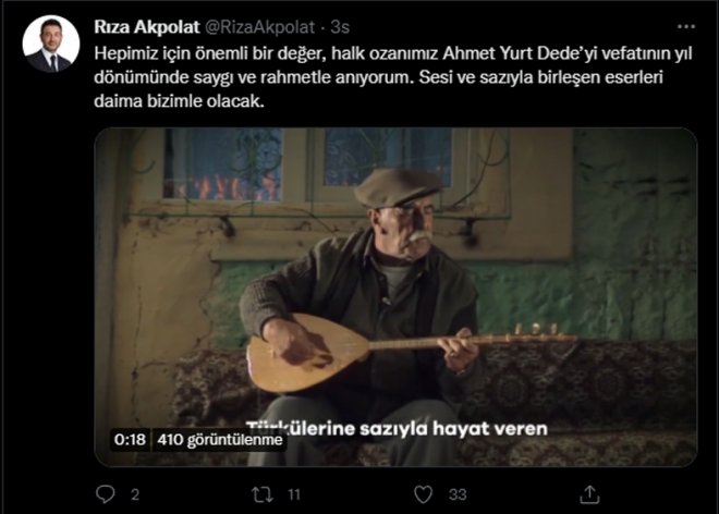 Başkan Akpolat, "Hepimiz için önemli bir değer, halk ozanımız Ahmet Yurt Dede’yi vefatının yıl dönümünde saygı ve rahmetle anıyorum. Sesi ve sazıyla birleşen eserleri daima bizimle olacak." paylaşımında bulundu.