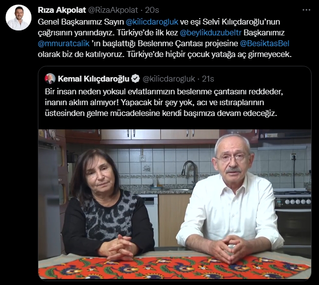 Beşiktaş Belediye Başkanı Rıza Akpolat, Twitter'da CHP Genel Başkanı Kemal Kılıçdaroğlu'nun videosunu paylaşarak, "Genel Başkanımız Sayın @kilicdarogluk ve eşi Selvi Kılıçdaroğlu’nun çağrısının yanındayız. Türkiye’de ilk kez @beylikduzubeltr Başkanımız @mmuratcalik ’ın başlattığı Beslenme Çantası projesine @BesiktasBel olarak biz de katılıyoruz. Türkiye’de hiçbir çocuk yatağa aç girmeyecek." ifadelerini kullandı.