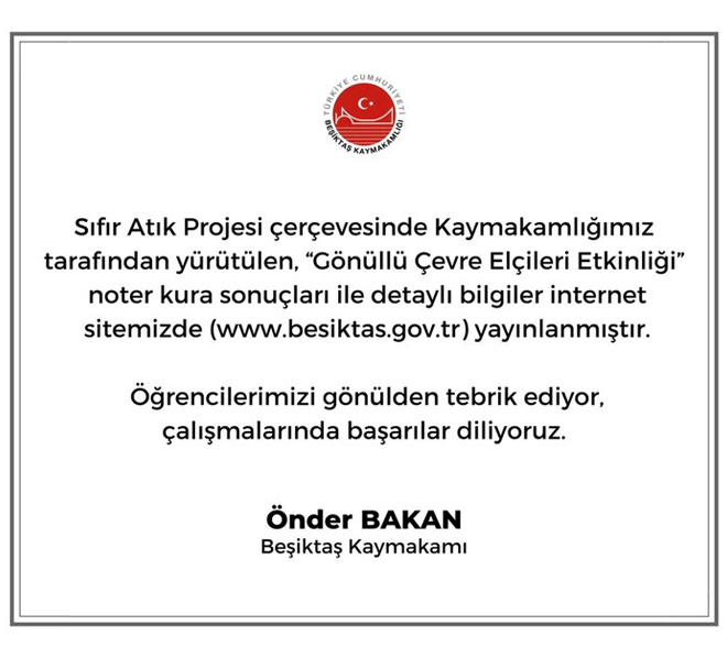 Beşiktaş Kaymakamlığı, "Sıfır Atık Projesi" çerçevesinde Kaymakamlık tarafından yürütülen "Gönüllü Çevre ELçileri Etkinliği" noter kura sonuçlarının belli olduğu bildirildi. Kaymakamlıktan yapılan açıklamada aşağıdaki ifadelere yer verildi: