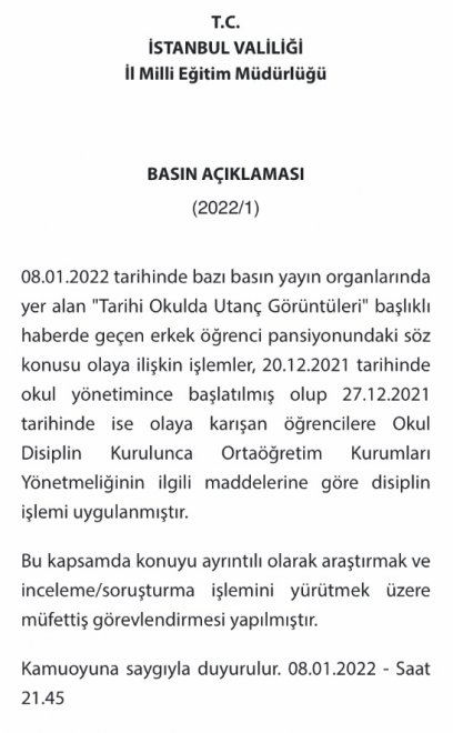 Açıklamada şu ifadeler kullanıldı: “08.01.2022 tarihinde bazı basın yayın organlarında yer alan “Tarihi Okulda Utanç Görüntüleri” başlıklı haberde geçen erkek öğrenci pansiyonundaki söz konusu olaya ilişkin işlemler, 20.12.2021 tarihinde okul yönetimince başlatılmış olup 27.12.2021 tarihinde ise olaya karışan öğrencilere Okul Disiplin Kurulunca Ortaöğretim Kurumları Yönetmeliğinin ilgili maddelerine göre disiplin işlemi uygulanmıştır.